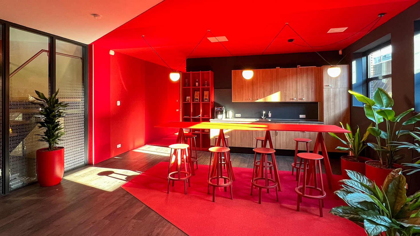 Onder de twee zitgedeeltes (vergader en lounge) hebben we tapijttegels gelegd ook in de hexagon vorm in de huisstijlkleuren en in de kleur blauw (koel) en groen (elektrisch). Naast de functionele oplossing (akoestiek) zorgen de tapijttegels ook voor extra sfeer in de ruimte.