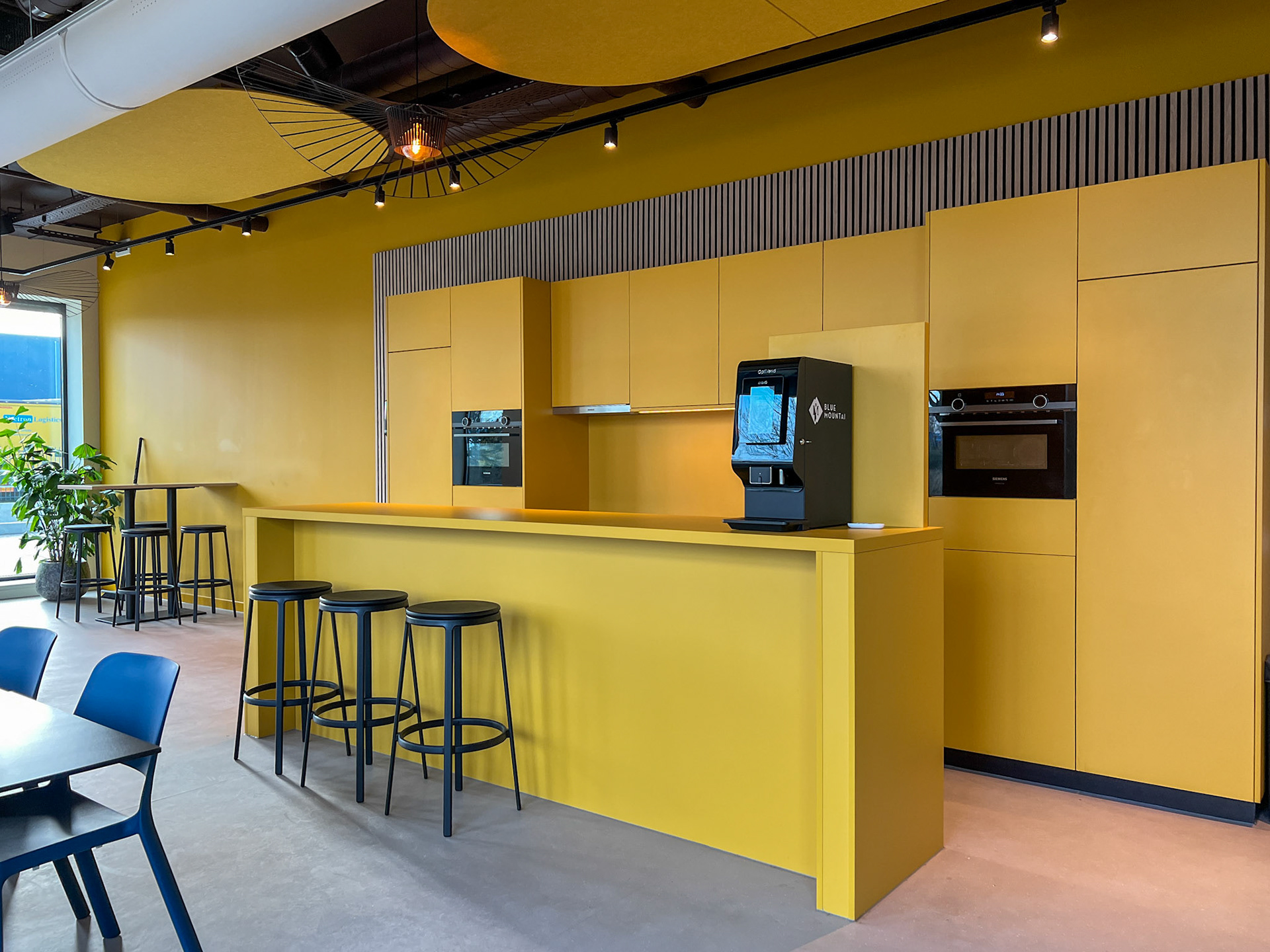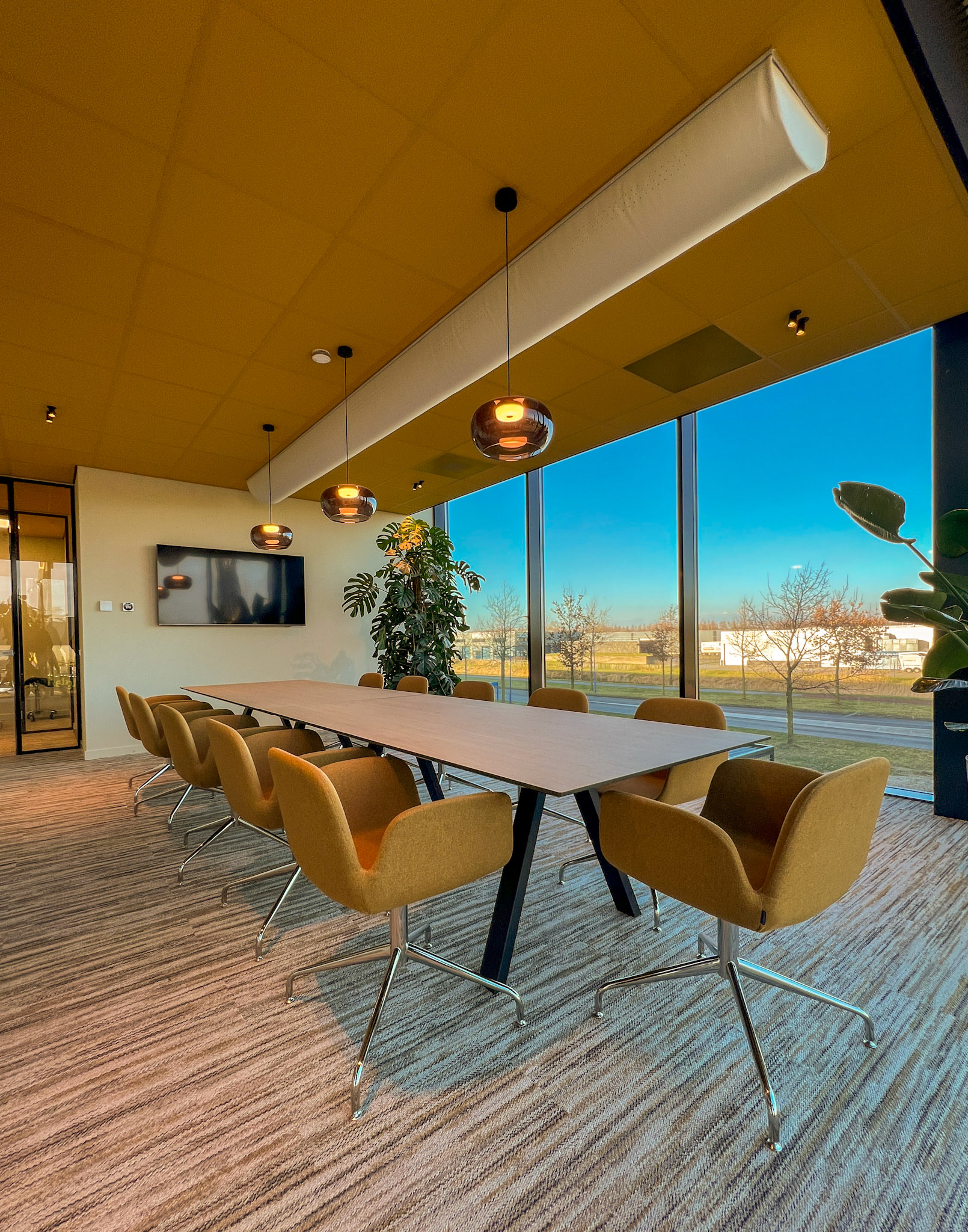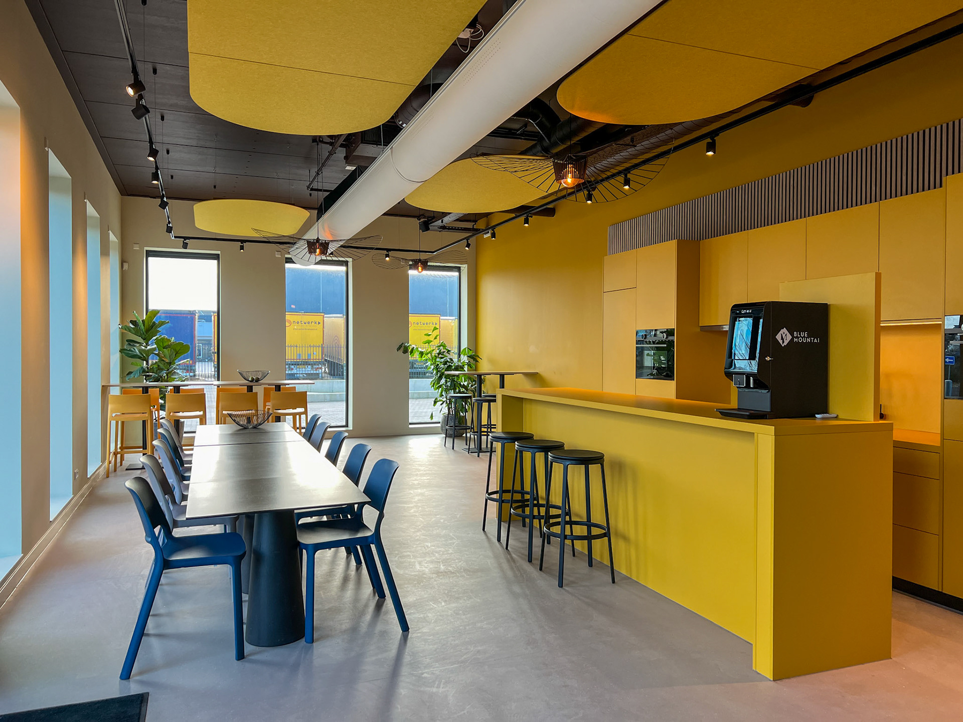 De opdracht: Creëer in de kantoren en kantine een totaal andere sfeer dan in productieruimte. Hou rekening dat wij 7 dagen in de week geopend zijn en werken met dag- en avonddiensten. Uitgangspunt kleurgebruik zijn de huisstijlkleuren: het geel+donkerbruin uit het logo met als accentkleuren blauw en zwart. In de kantine verschillende zitmogelijkheden gecreëerd: een bank, lange tafels en hoge zits, een groot keukenblok en een bar. Om in de pauzes voor een snellere doorloop te zorgen is de koffiecorner niet in het keukenblok verwerkt maar op de bar geplaatst. De gele PET felt panelen aan het plafond zorgen voor een visueel en akoestisch comfort. Speelse verlichting maakt het geheel af! Op de bovenverdieping bevinden zich de kantoorruimtes; een bespreekruimte en een callcenter met diverse werkplekken. Afgescheiden met een roomdivider met planten, glas en een whiteboard. Privacy maar ook zicht op de omliggende ruimte. De omgeving voelt aan als een open ruimte maar door de slimme indeling garandeert dit voldoende privacy. Het toepassen van kleuren in de werkomgeving levert een positieve bijdrage aan productiviteit en werkplezier.
