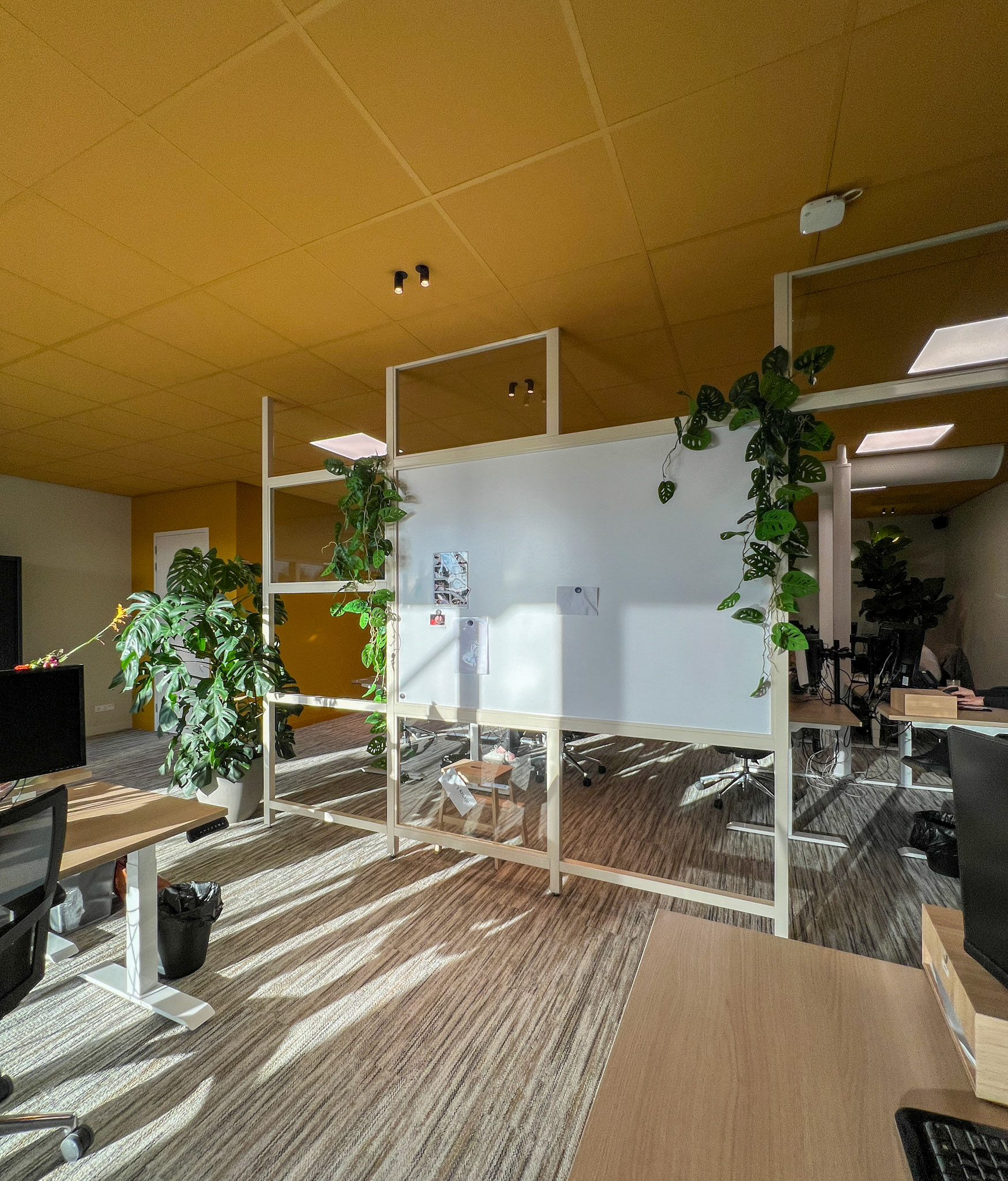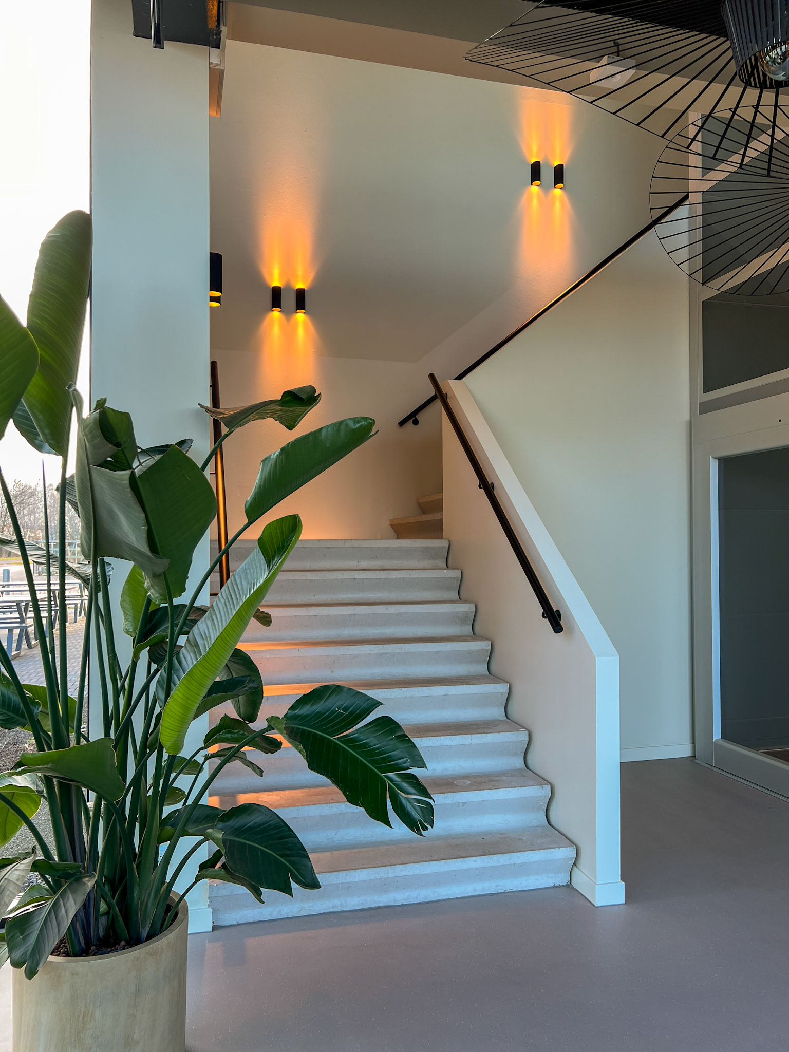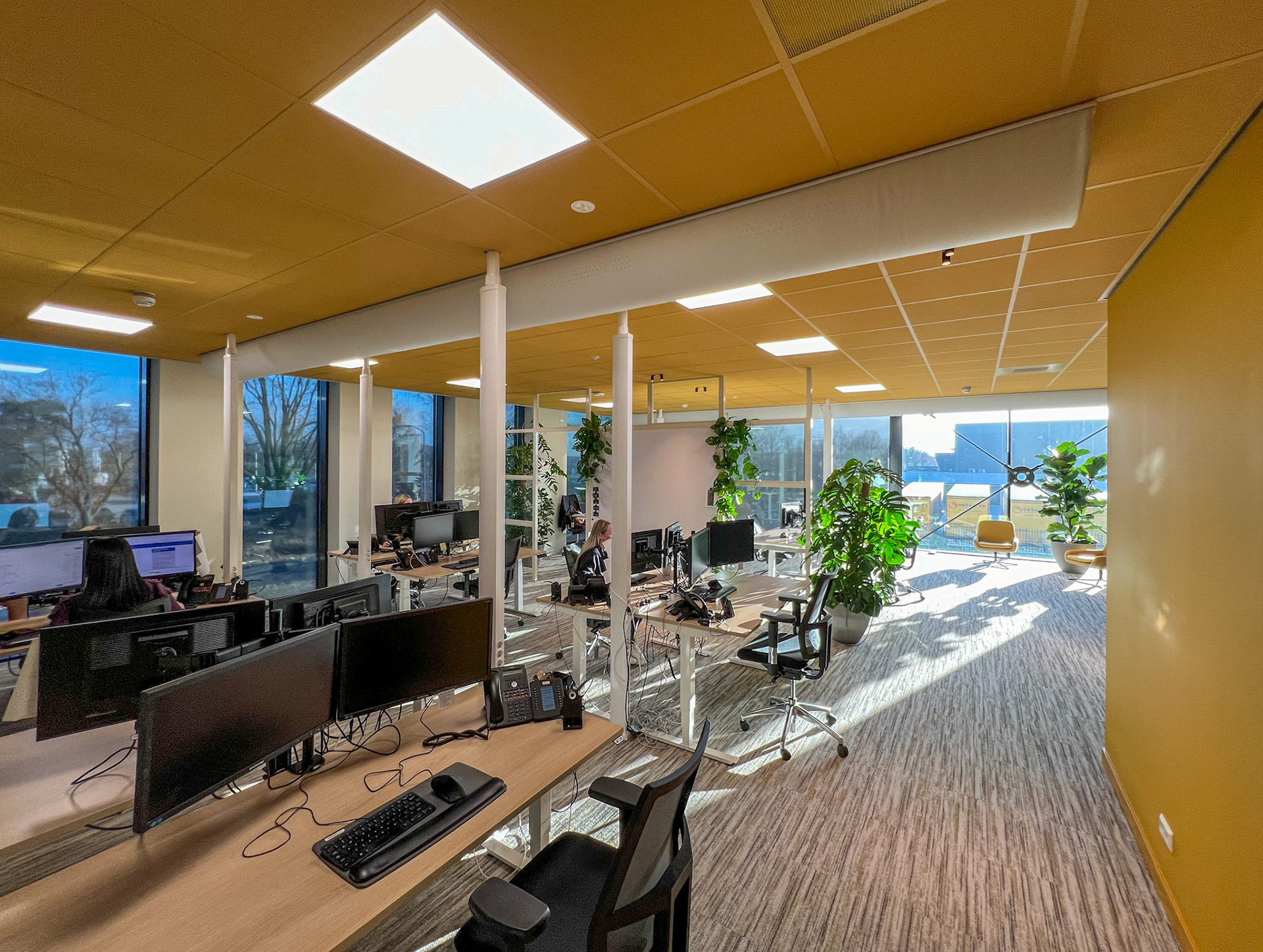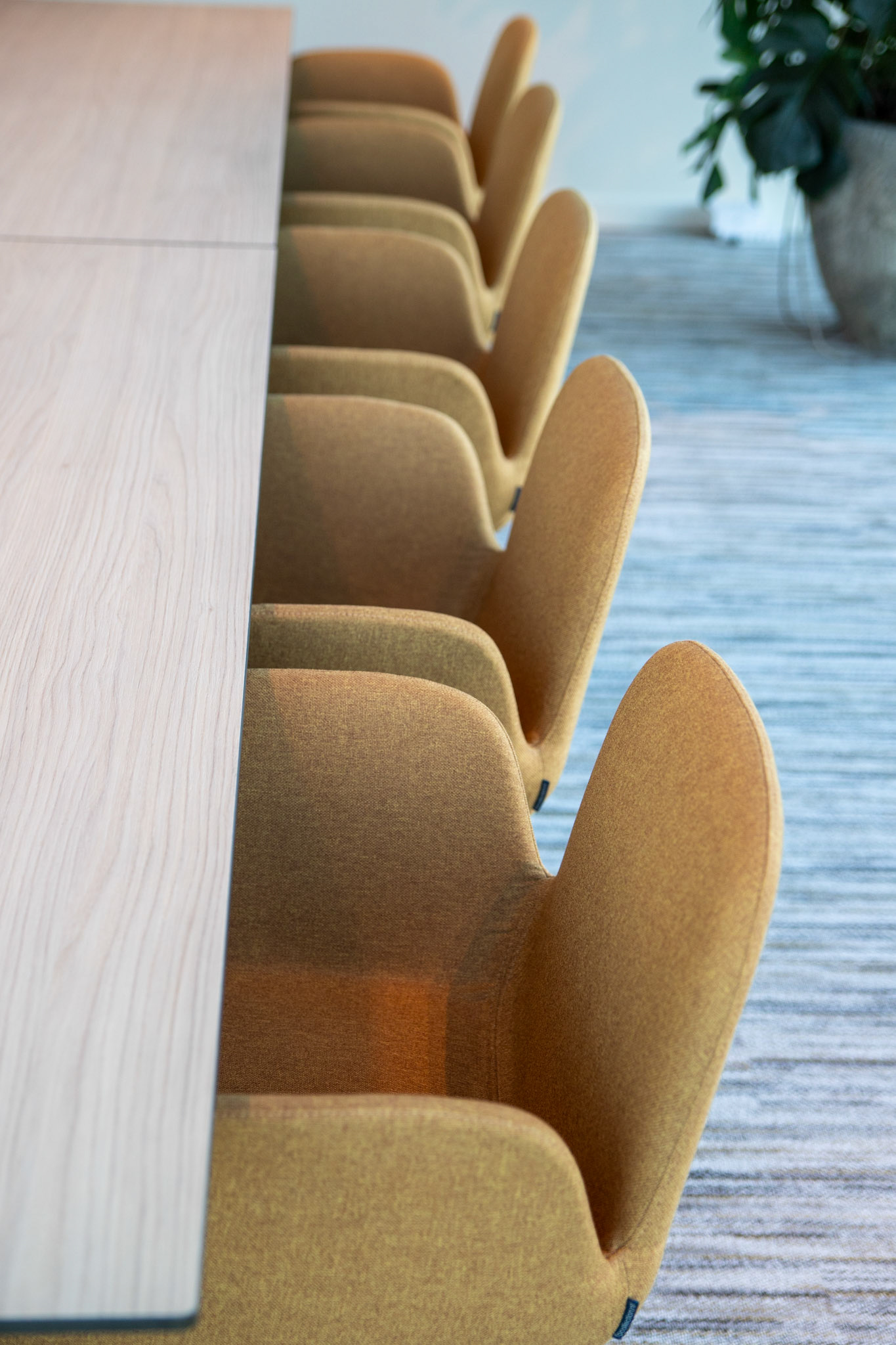 De opdracht: Creëer in de kantoren en kantine een totaal andere sfeer dan in productieruimte. Hou rekening dat wij 7 dagen in de week geopend zijn en werken met dag- en avonddiensten. Uitgangspunt kleurgebruik zijn de huisstijlkleuren: het geel+donkerbruin uit het logo met als accentkleuren blauw en zwart. In de kantine verschillende zitmogelijkheden gecreëerd: een bank, lange tafels en hoge zits, een groot keukenblok en een bar. Om in de pauzes voor een snellere doorloop te zorgen is de koffiecorner niet in het keukenblok verwerkt maar op de bar geplaatst. De gele PET felt panelen aan het plafond zorgen voor een visueel en akoestisch comfort. Speelse verlichting maakt het geheel af! Op de bovenverdieping bevinden zich de kantoorruimtes; een bespreekruimte en een callcenter met diverse werkplekken. Afgescheiden met een roomdivider met planten, glas en een whiteboard. Privacy maar ook zicht op de omliggende ruimte. De omgeving voelt aan als een open ruimte maar door de slimme indeling garandeert dit voldoende privacy. Het toepassen van kleuren in de werkomgeving levert een positieve bijdrage aan productiviteit en werkplezier.