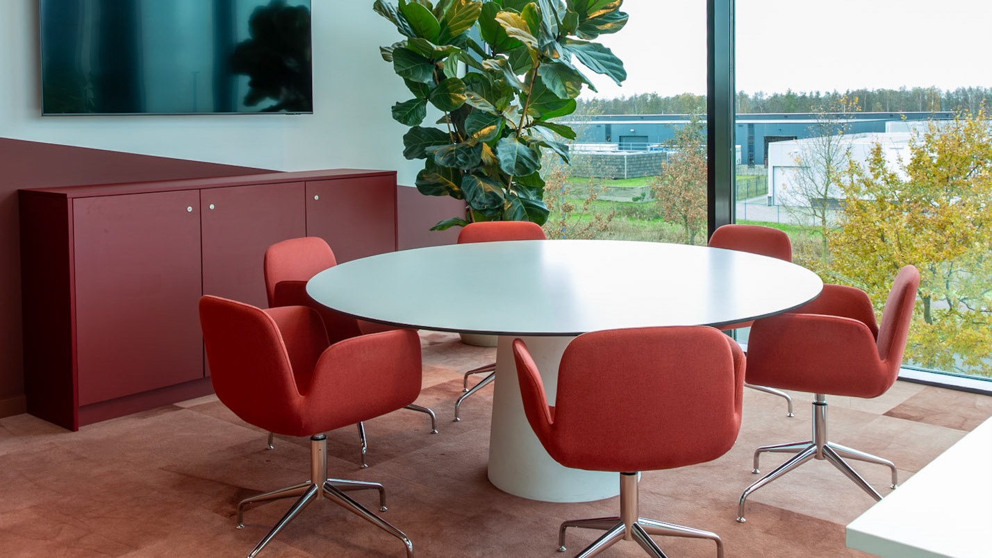In het midden van de kamer staat een opvallende ronde poef met een fluweelachtig patroon. Gecombineerd met een zacht vloerkleed eronder, ontstaat er een gezellige en stijlvolle zithoek.