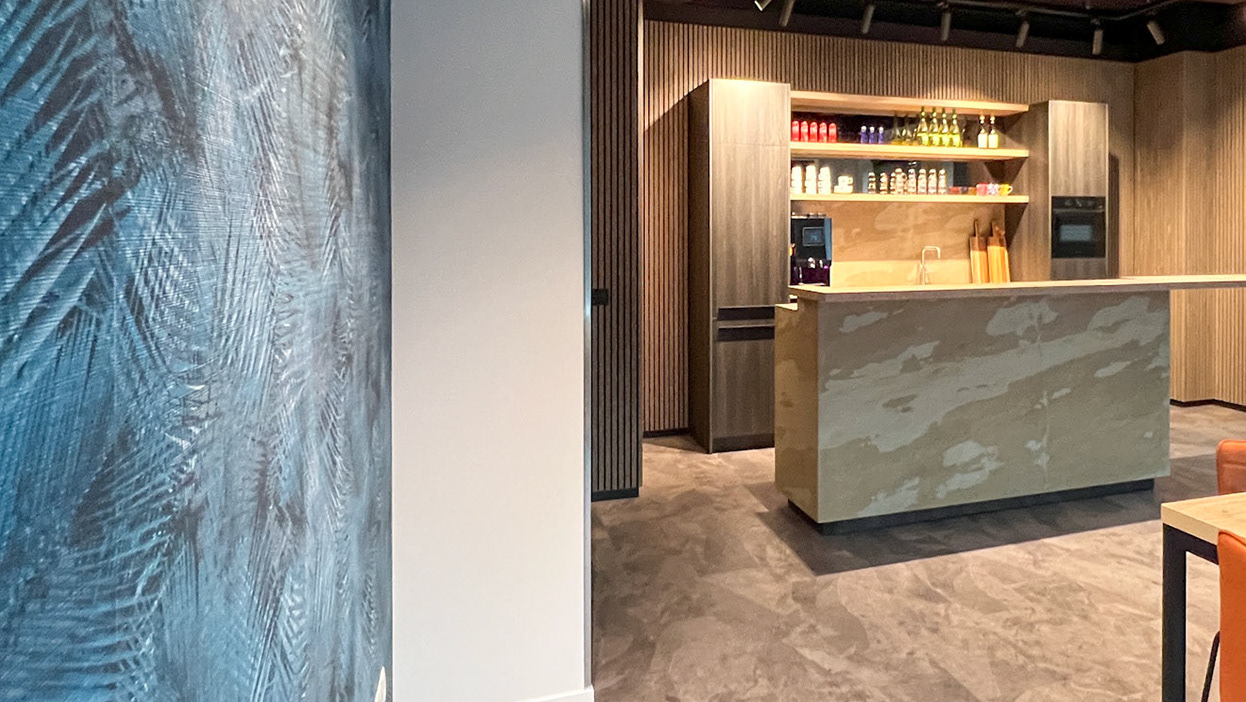 Aan de andere kant van de kamer hebben we een op maat gemaakte kastenwand gemaakt in donker hout die meteen de aandacht trekt. Deze biedt niet alleen volop opbergruimte, maar versterkt ook de luxe uitstraling van de ruimte. De zwarte rails met spotverlichting geven een moderne touch, terwijl de grote losstaande spiegel de ruimte optisch vergroot.