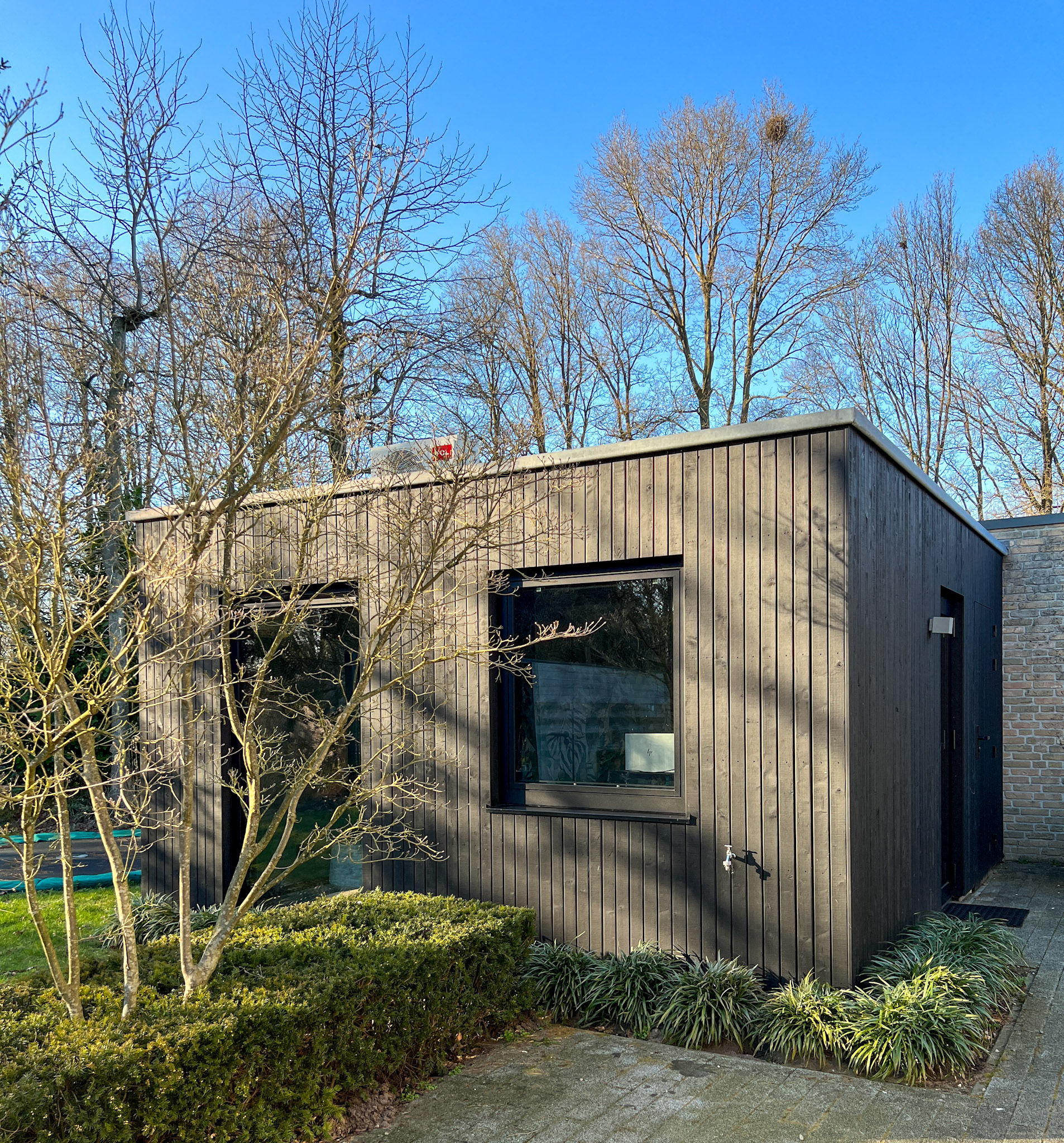Naast een advies voor een nieuwe indeling van de woonkamer van dit mooie familiehuis mochten we ook voor de tuinstudio een plan maken. De woonwens voor de studio was een afsluitbare chillruimte voor de twee puberkids maar ook een plek om lekker en rustig te kunnen werken. Het ontwerp van deze aanbouw geeft een moderne en stoere twist aan het huis door gebruik van zwart hout als gevelbekleding. Het ontwerp van het interieur is hierop aangepast maar straalt juist ook warmte en gezelligheid uit. Een uniek behang met botanische print incl. een ‘hidden door’ en een tuintafel in een opvallende rode kleur zorgen voor een mooi contrast in deze natuurlijke omgeving.