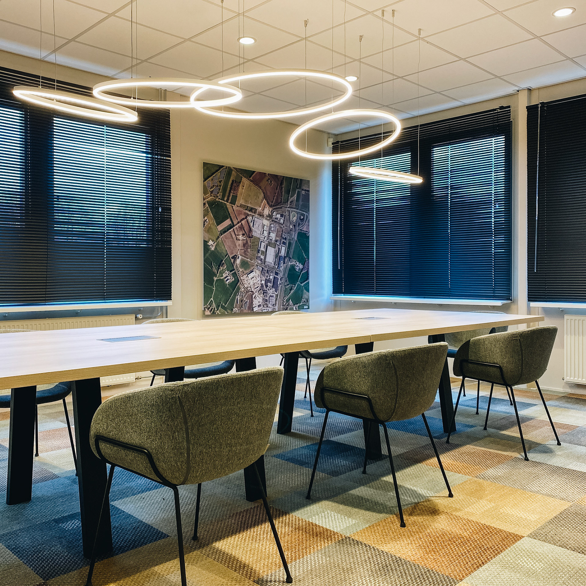 Voor het kantoor van bedrijventerrein Laarberg, waar toekomstgerichte bedrijven grenzeloze mogelijkheden en ondersteuning krijgen van een team van specialisten bij het vormgeven en realiseren van hun plannen, mochten wij zowel het ontwerp als de uitvoering verzorgen voor de restyling van het bestaande kantoor. De opdracht: creëer verschillende bespreekruimtes voor kleine én grote groepen met daarbij werkplekken waar men ongestoord kan werken. Gekozen voor een opvallende en sfeervolle vloer met een rustige basis met licht hout en warme naturel tinten. De led verlichting zorgt voor een mooie eyecatcher. Veel planten en mooie visuals met oude historische landkaarten van het gebied gecombineerd met actuele dronefoto's van het bedrijventerrein zorgen voor de finish touch.