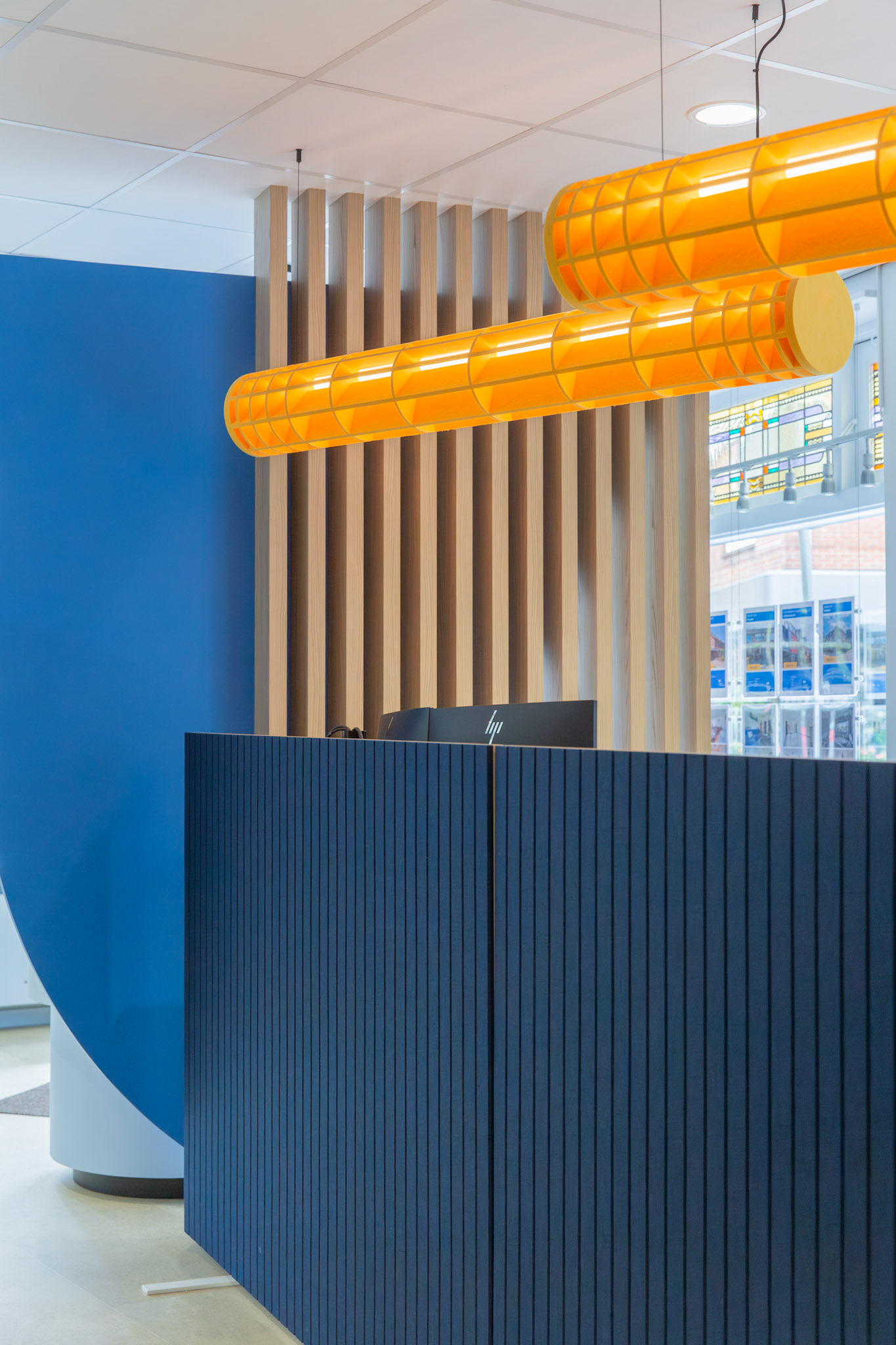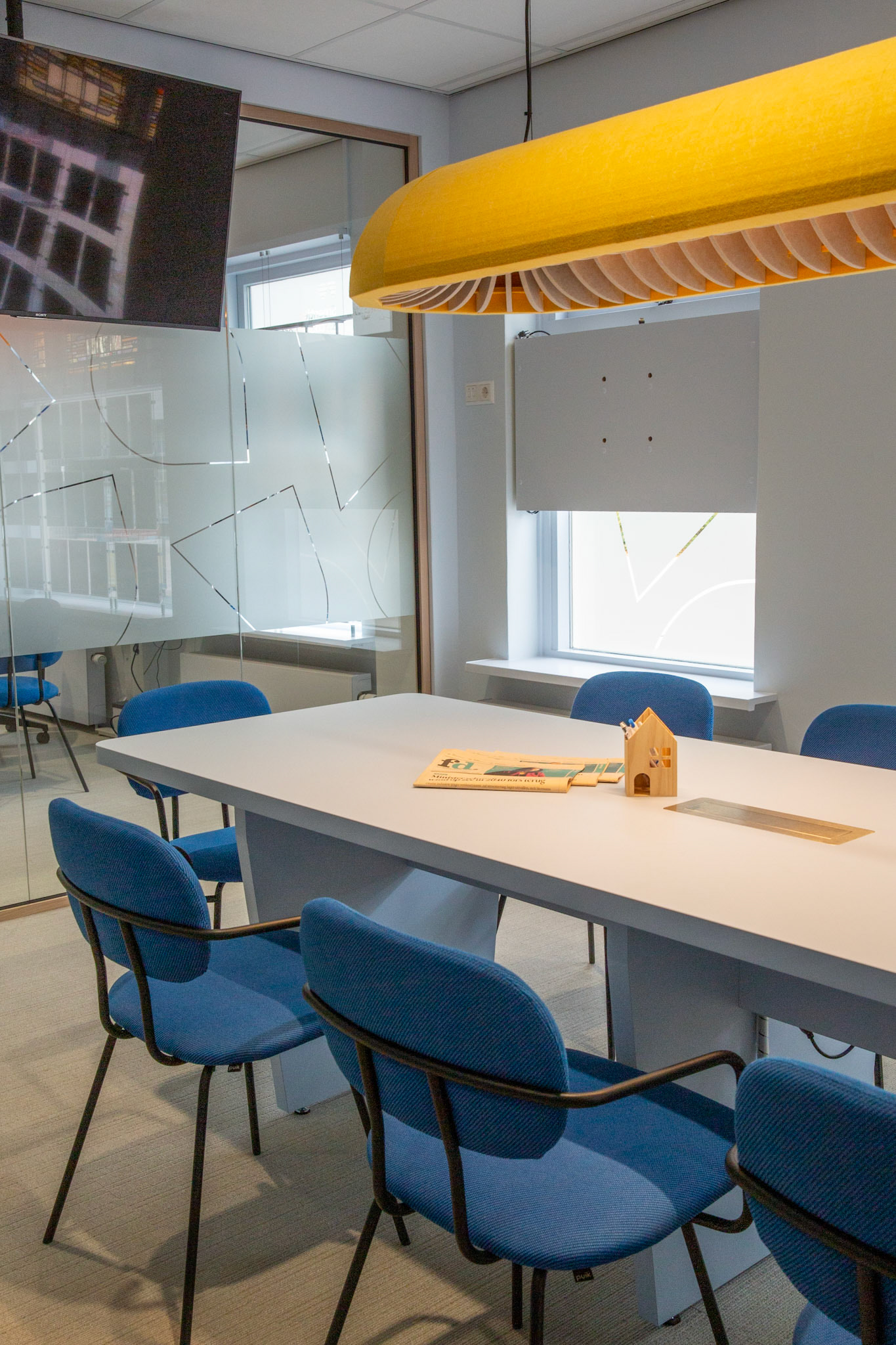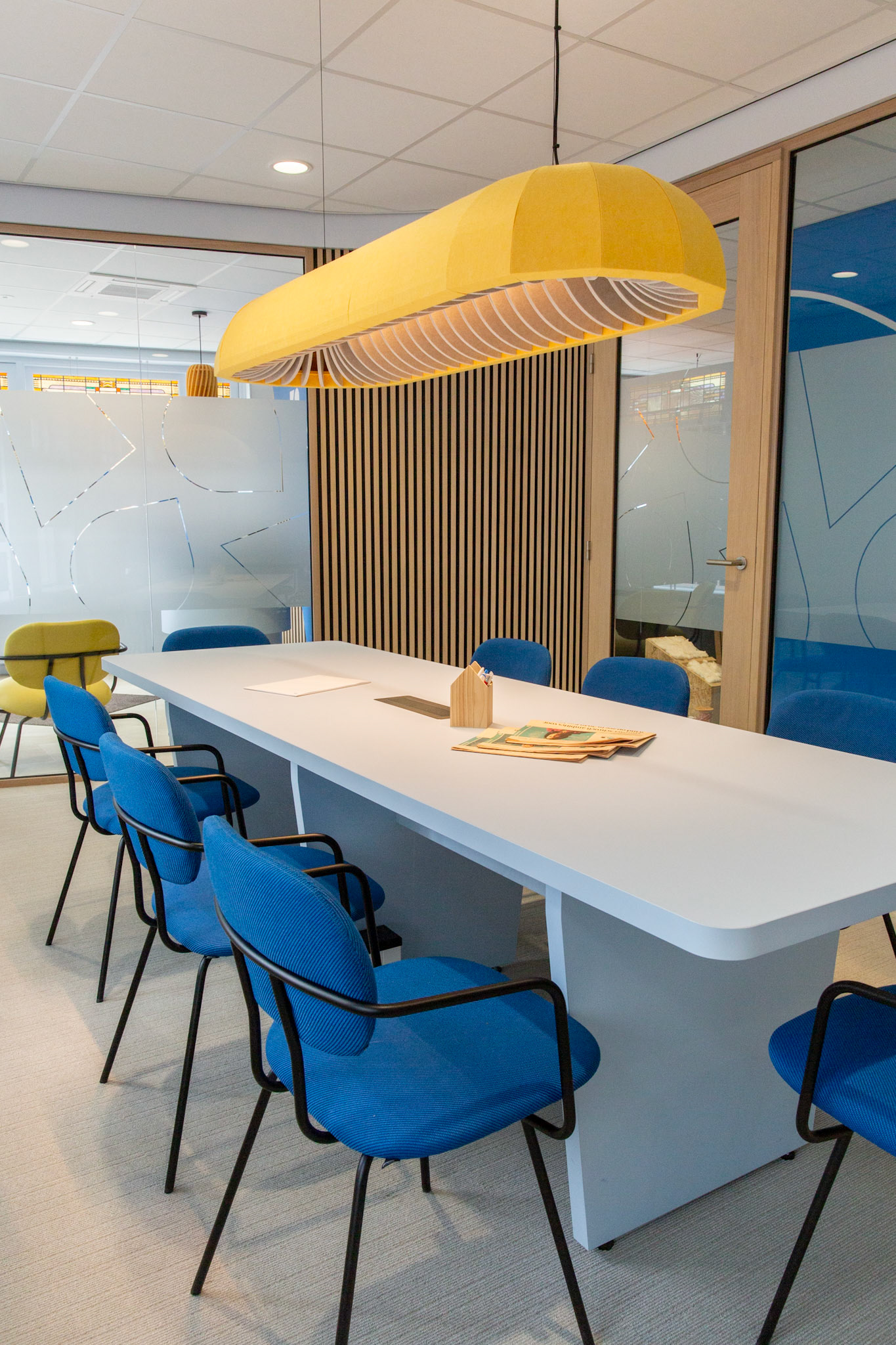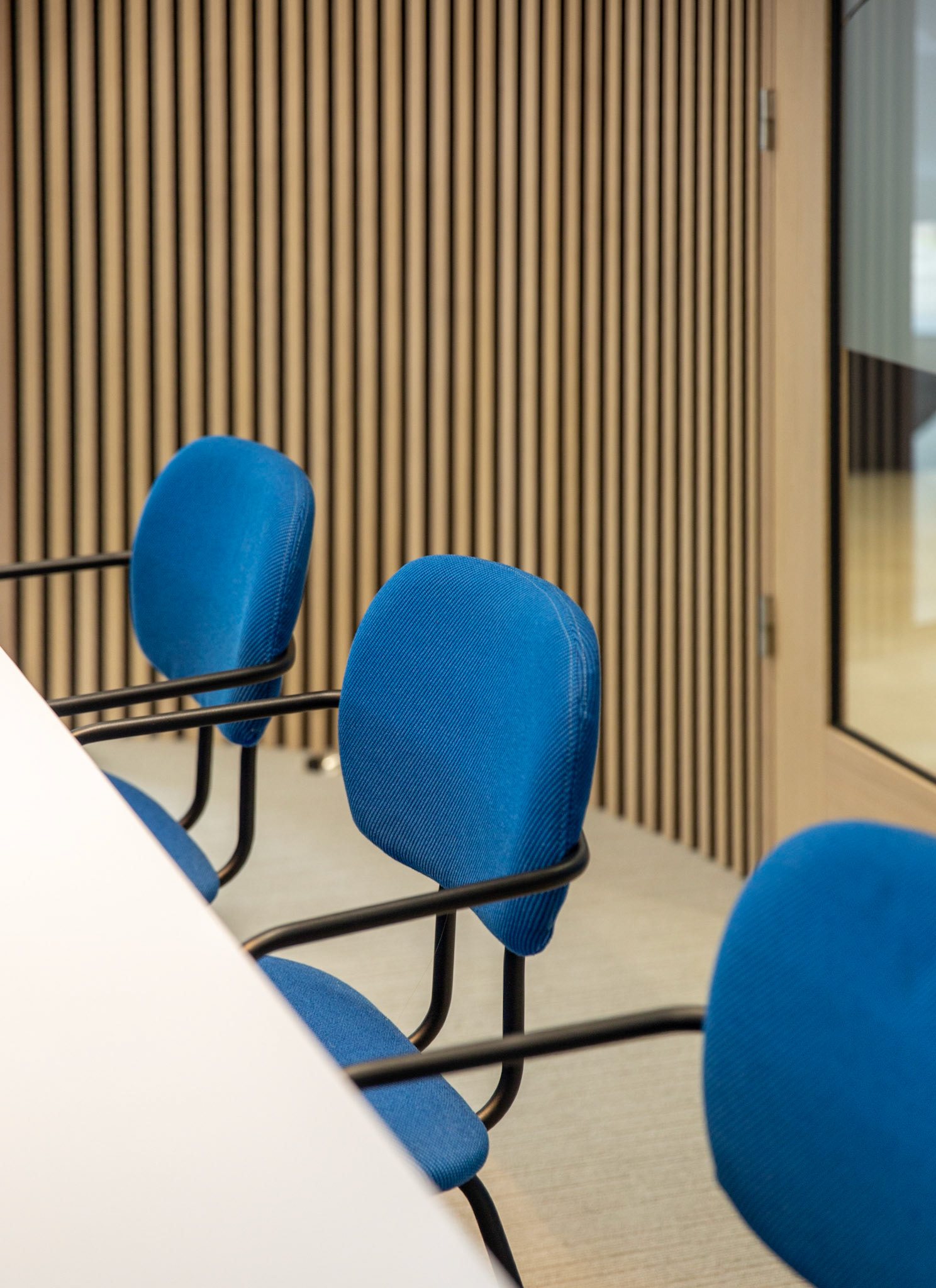 Strakke lijnen, een moderne uitstraling en blauw als herkenbaar accent, volledig afgestemd op het merk en kantoorontwerp van Licent.