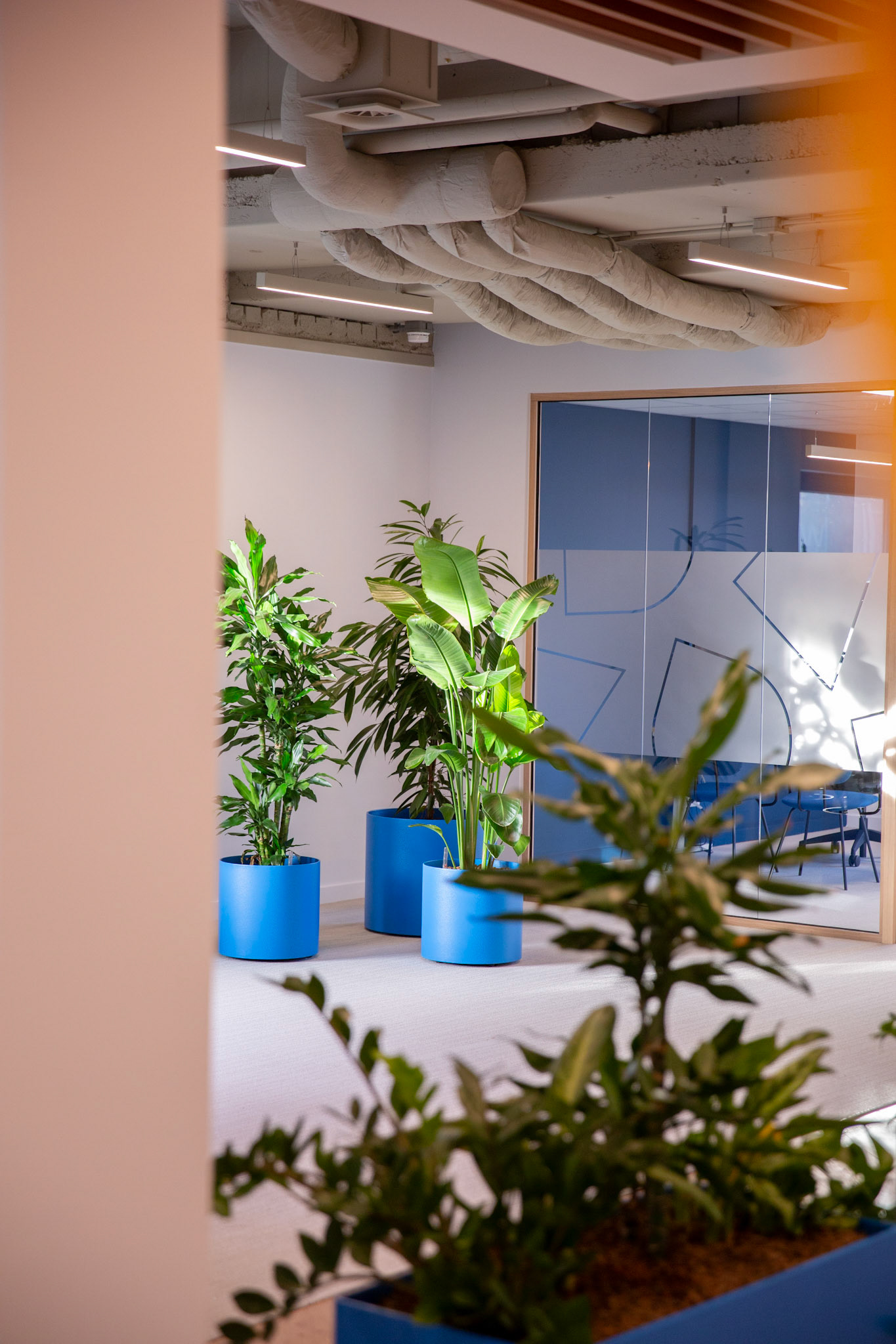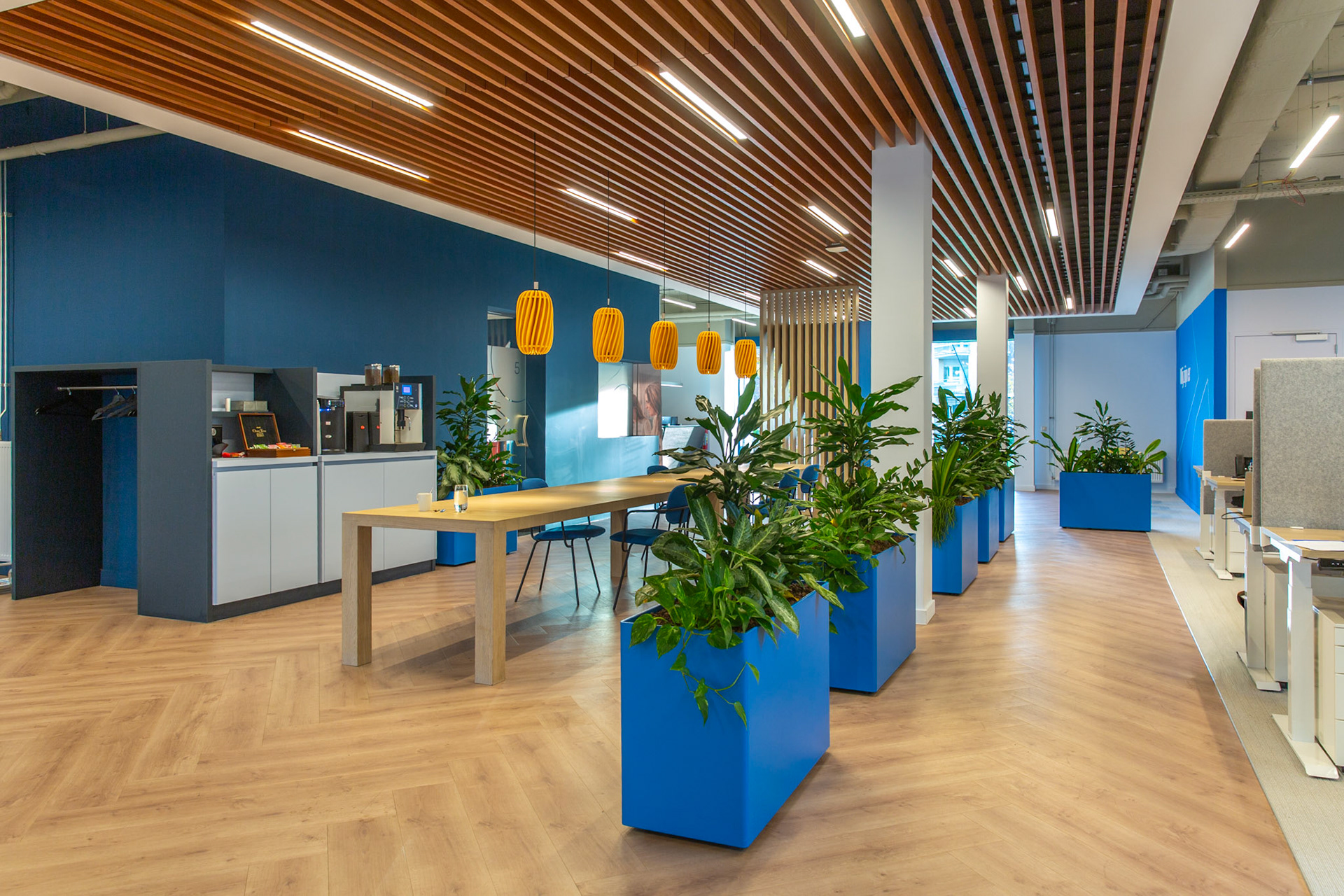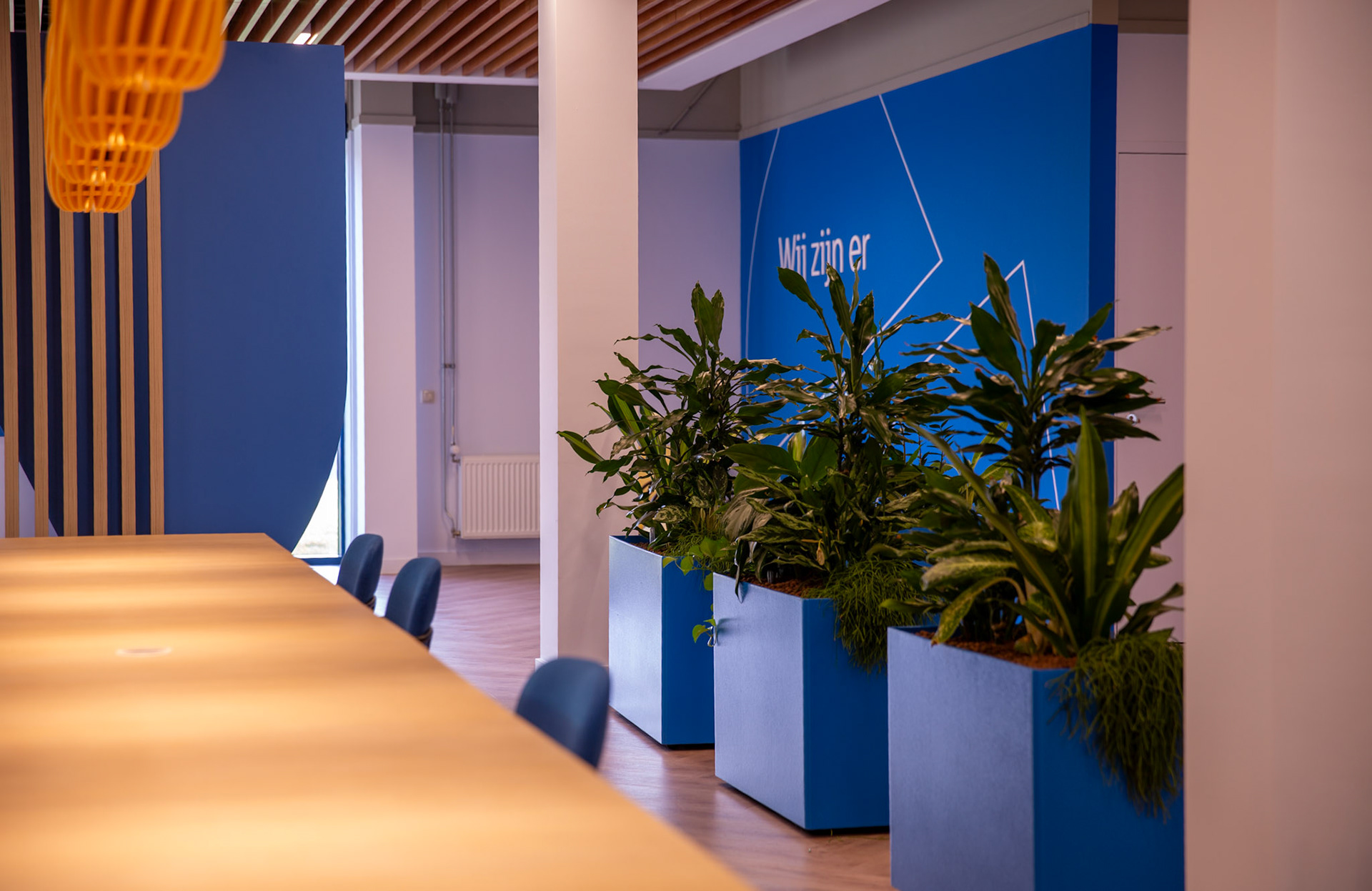 Door het creëren van afzonderlijke werkzones en flexibele overlegruimtes ontstaat een prettige balans tussen focus en ontmoeting. Een echte eyecatcher is de bijna 6 meter lange tafel, die fungeert als multifunctionele ontmoetingsplek voor vergaderingen, overleg en informele koffiemomenten.