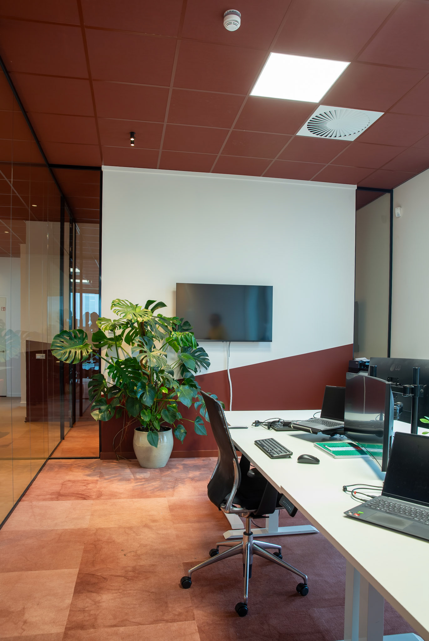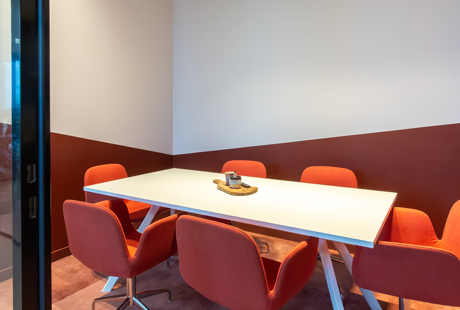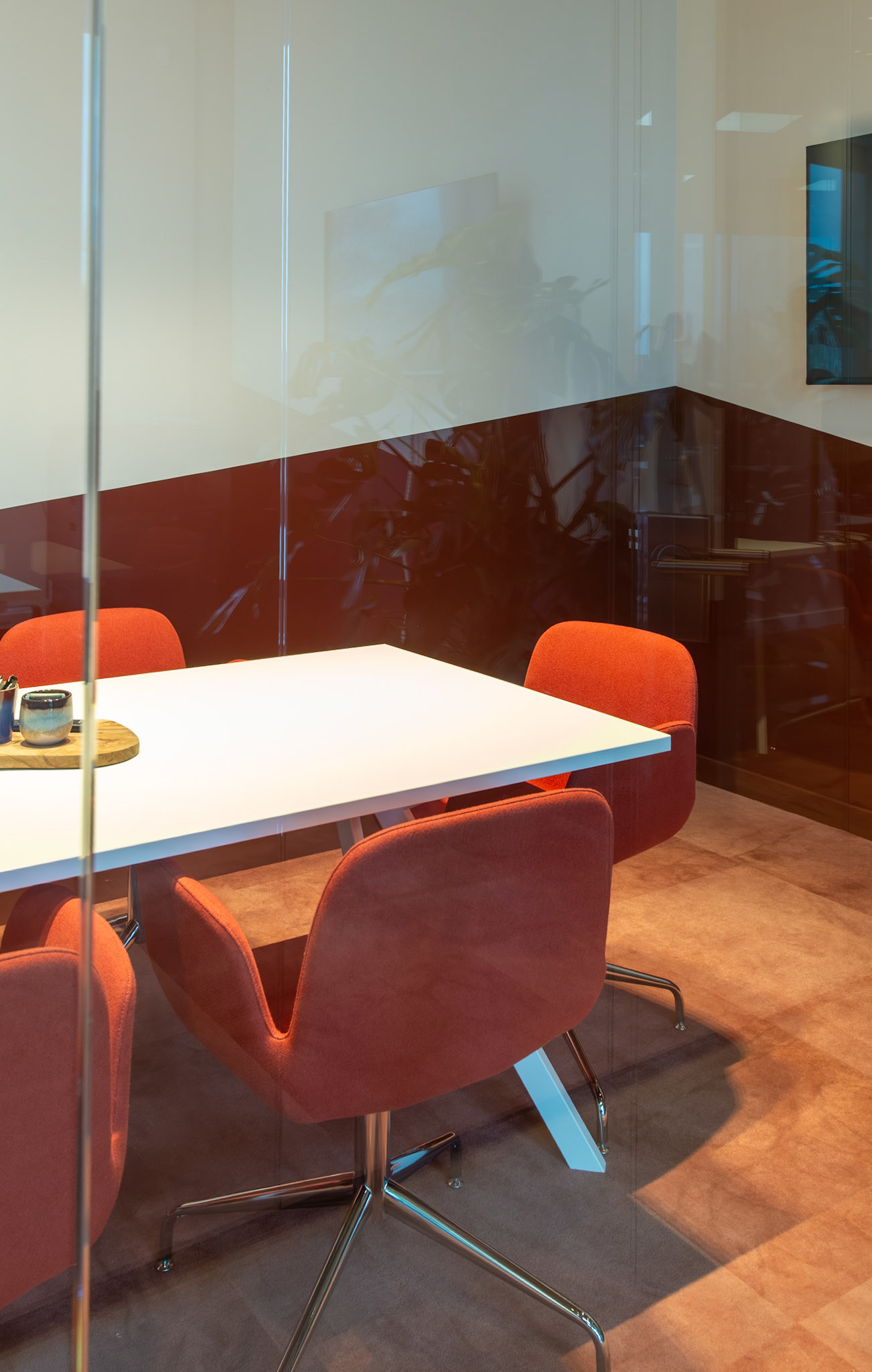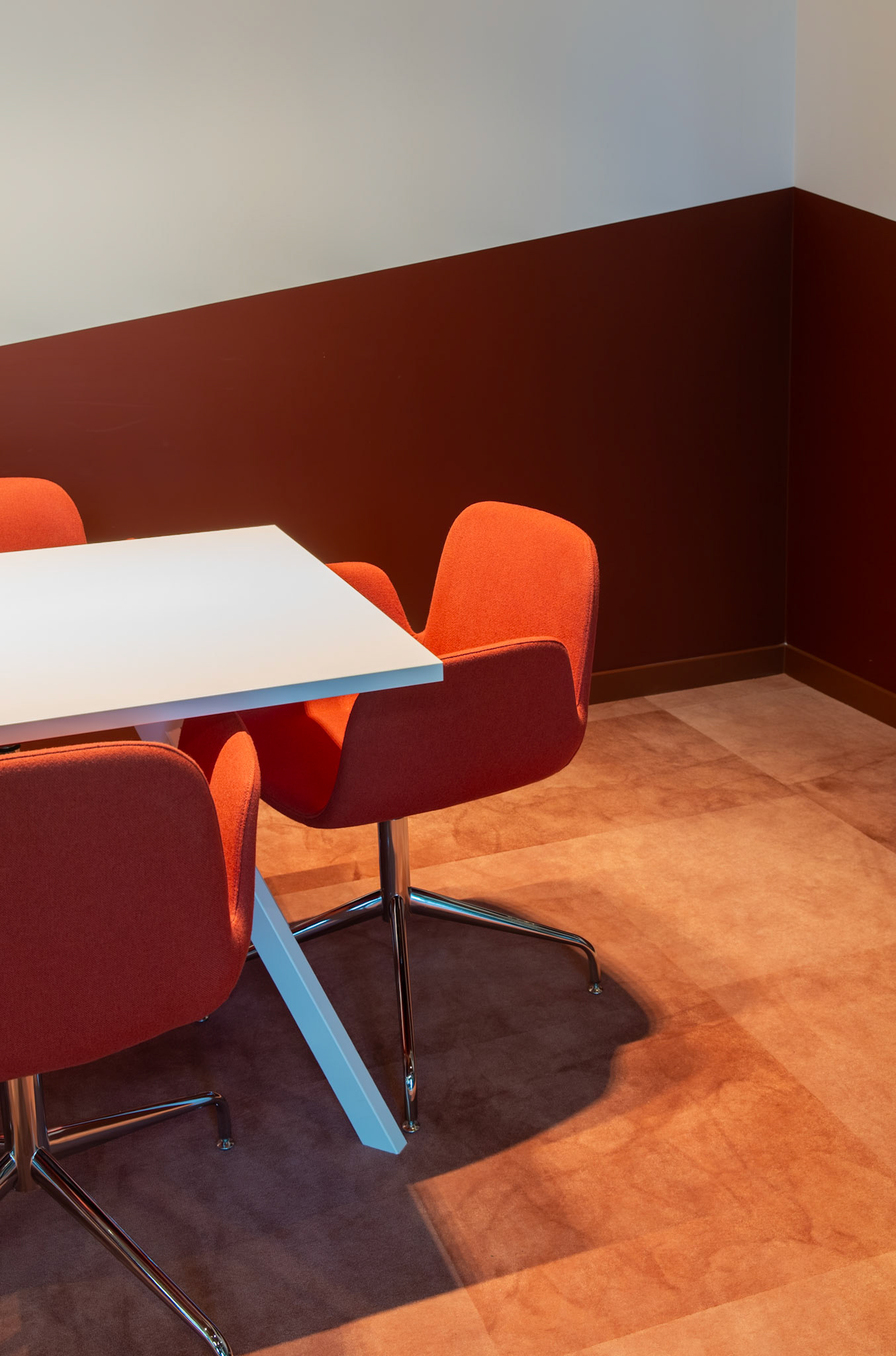 De combinatie met strakke, witte bureaus zorgt voor een frisse en evenwichtige compositie, waarin functionaliteit en esthetiek naadloos samengaan. Het resultaat is een interieur dat zowel tijdloos als karaktervol is, een plek waar de identiteit van Moma Beauty volledig tot haar recht komt.