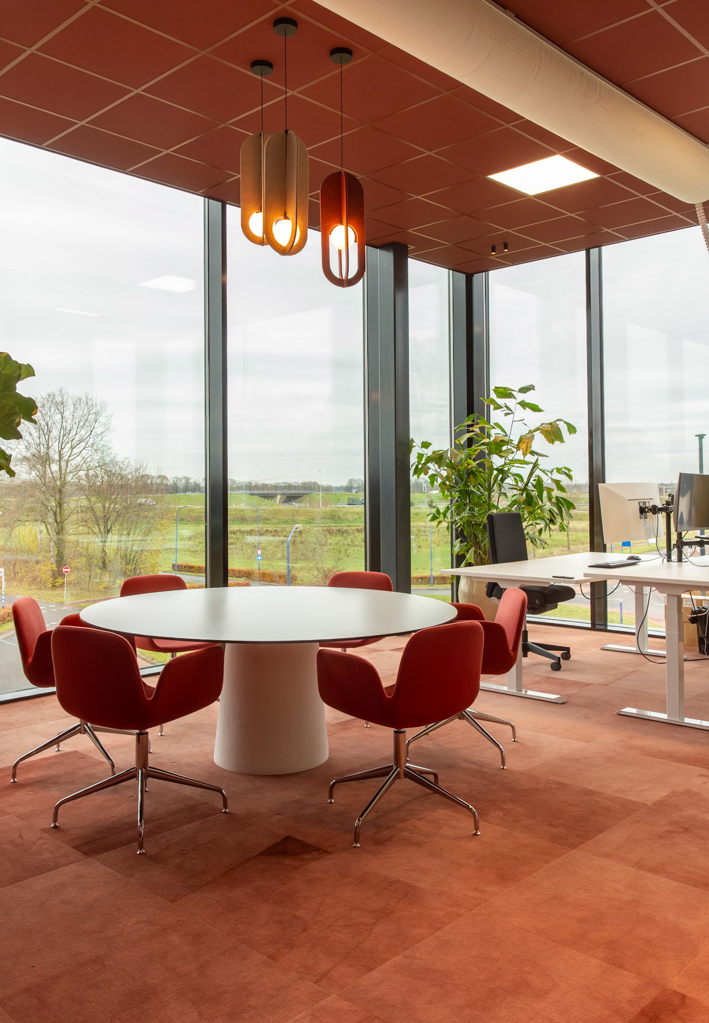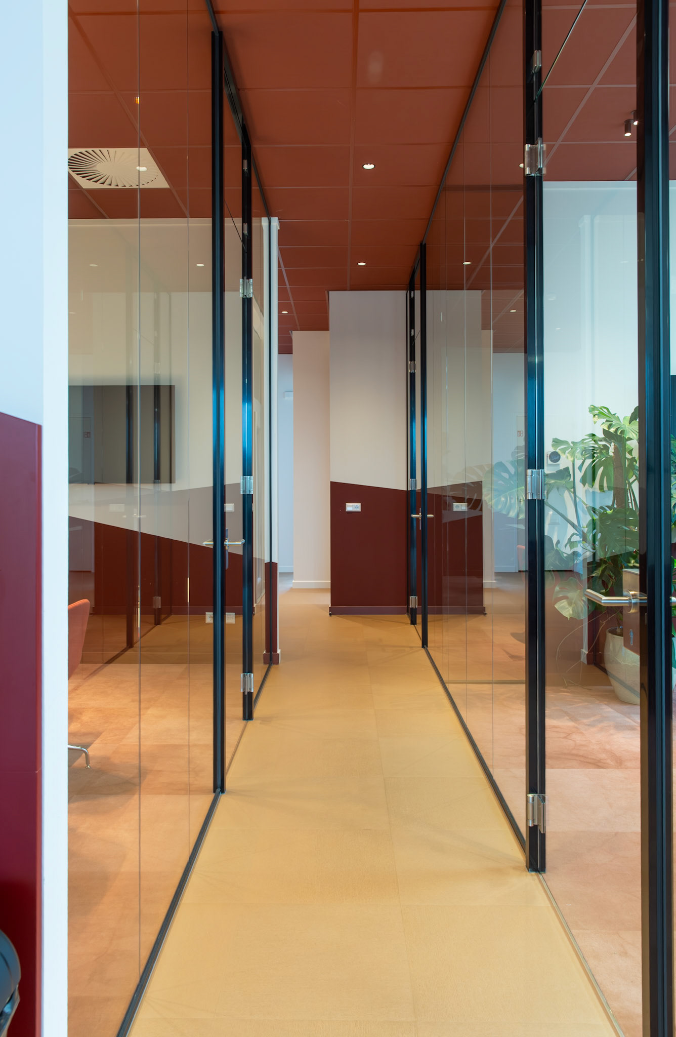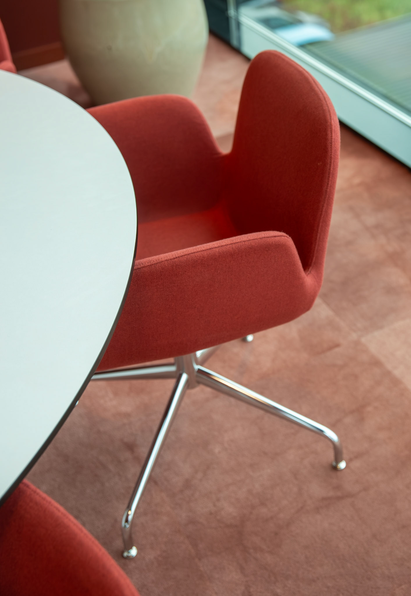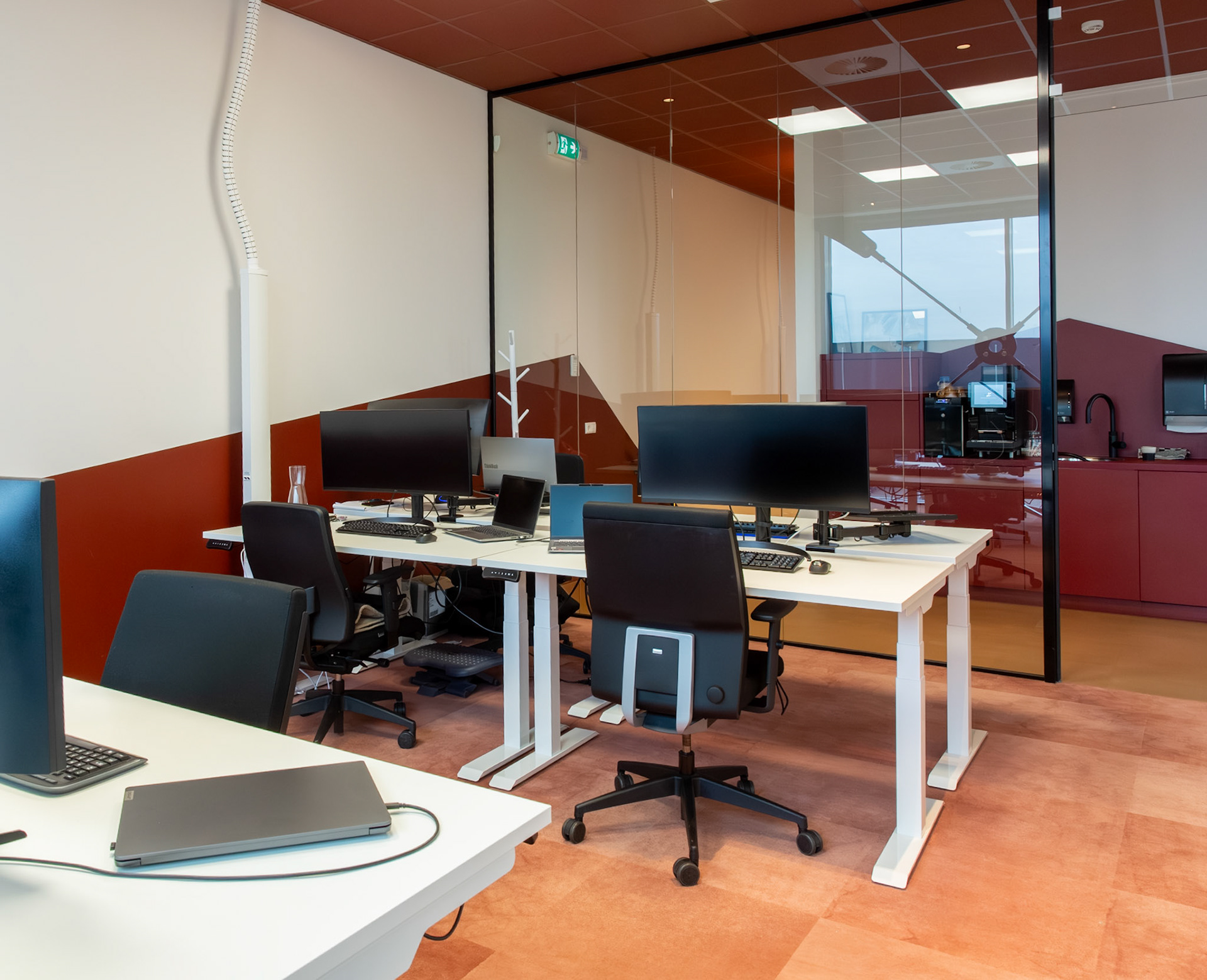 De combinatie met strakke, witte bureaus zorgt voor een frisse en evenwichtige compositie, waarin functionaliteit en esthetiek naadloos samengaan. Het resultaat is een interieur dat zowel tijdloos als karaktervol is, een plek waar de identiteit van Moma Beauty volledig tot haar recht komt.