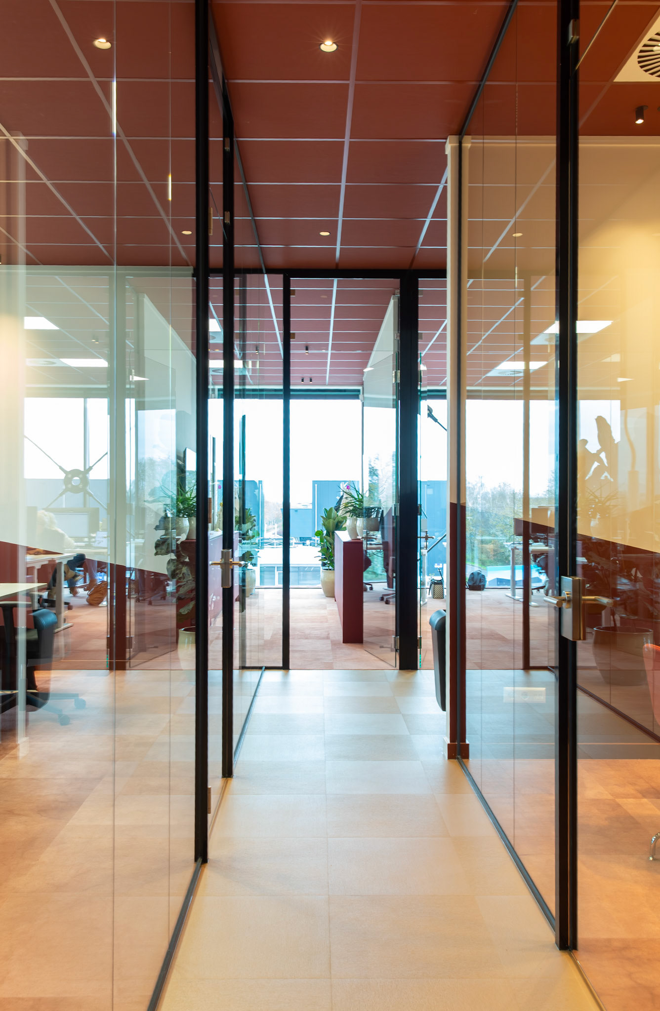Voor de gangen en looproutes introduceerden we een goudkleurige tegel die een stijlvolle, chique gelaagdheid toevoegt. Deze keuze creëert niet alleen een heldere routing, maar versterkt tevens de luxe beleving binnen het interieur.