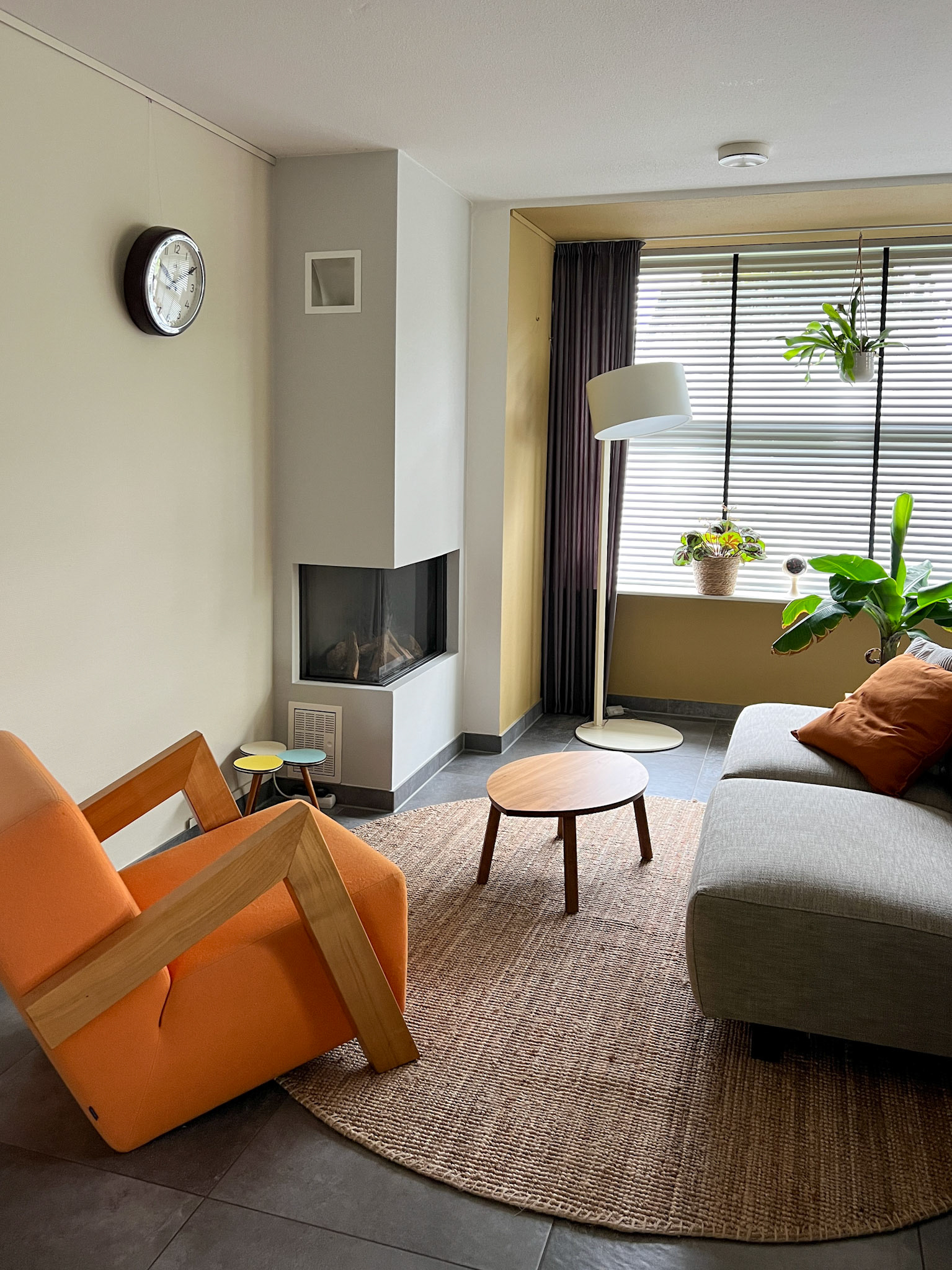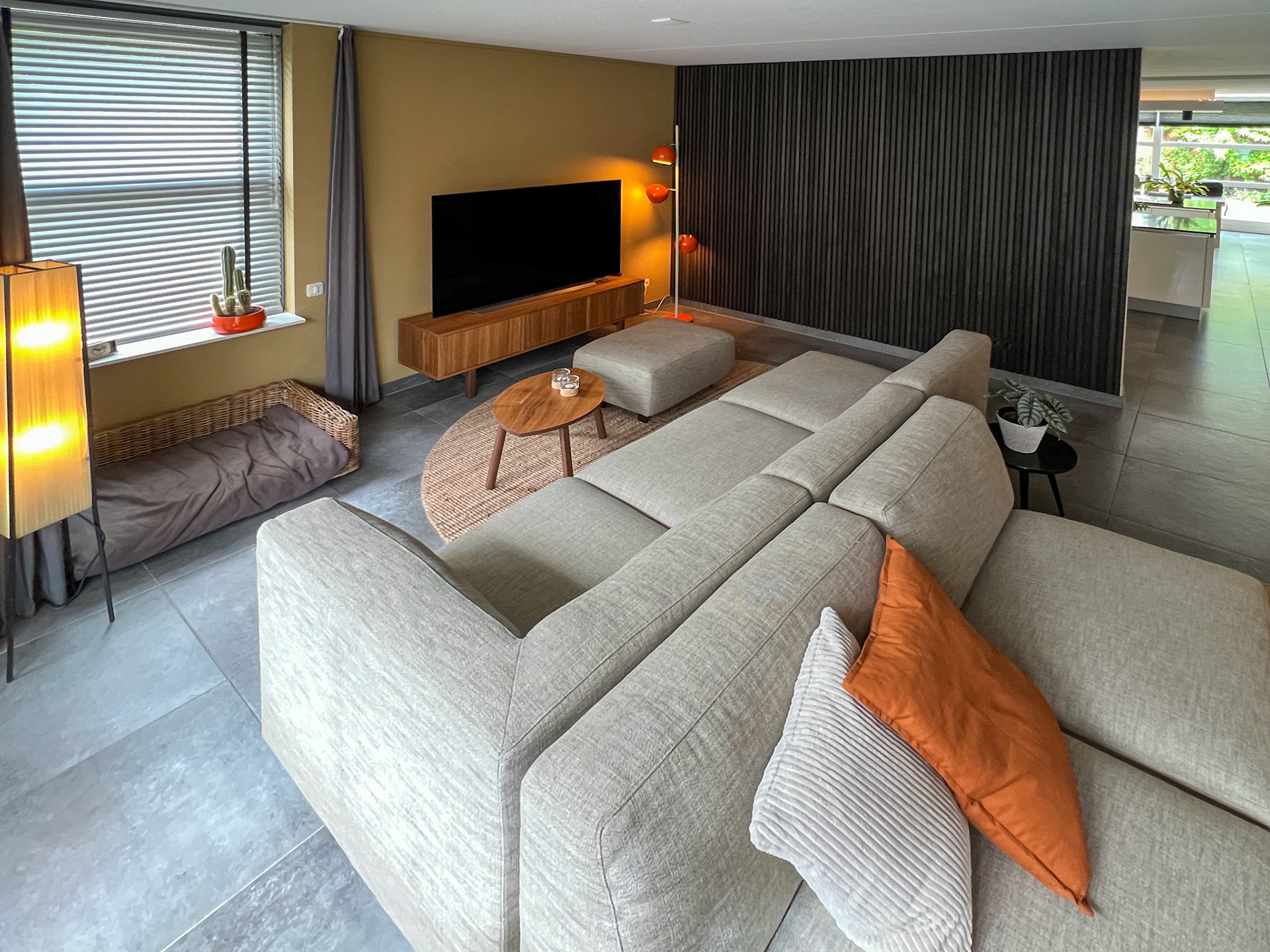 Verhuizen naar een andere woonplaats, dat betekent een nieuw huis en een andere inrichting. Maar hoe pakken we het nou aan? Toch maar de hulp van twee professionals inroepen. Et voilà! Zie hier het resultaat.    De vraag: we willen de bestaande grijs/bruine plavuizen op de benedenverdieping hanteren maar hoe krijgen we meer sfeer in de woning? We hebben gekozen voor het kleurpalet van de RIJKS kleuren. De verschillende tinten zijn mooi met elkaar te combineren en door de vergrijzing van de kleuren zijn ze rustig en niet te fel. De kleuren uit het grijze kleurpalet geeft het huis schaduwtinten en ook hebben we zo gespeeld met licht en donker. Om de akoestiek in de ruimte te verbeteren hebben we donkere houten wandpanelen geplaatst zowel in de keuken als in de woonkamer. Dit geeft een warme en stijlvolle uitstraling. Met de modulaire en vrijstaande bank in de woonkamer is een ziteiland gecreëerd. De ruimte wordt zo mooi gevuld en de bank wordt meteen een eyecatcher. Het dubbelzijdige ontwerp met de twee zitrichtingen is origineel en multifunctioneel. Op deze manier kun je samen en toch apart van elkaar op een bank zitten. Vraag jij je af of zo’n bank ook in jouw huis past? Of heb je een andere vraag? Let’s meet!